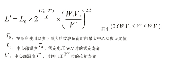 單獨(dú)的規(guī)格書中列出了上限類別溫度(+85℃、+105℃或 +125℃)下在100Hz頻率條件下的額定波紋電流IAC,R。已知芯子溫度(也可通過波紋電流負(fù)載、環(huán)境溫度以及風(fēng)速等參數(shù)來間接測(cè)算芯子溫度 )及工作電壓下的使用壽命取決于以下使用壽命公式: